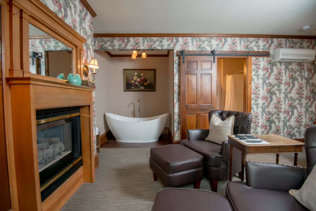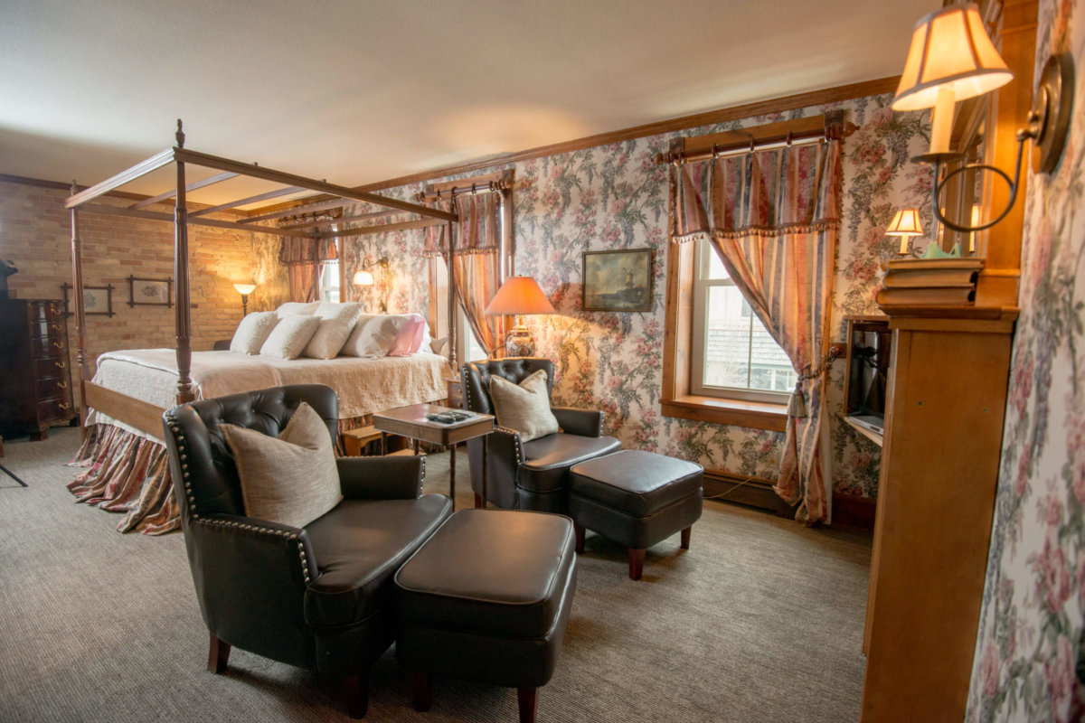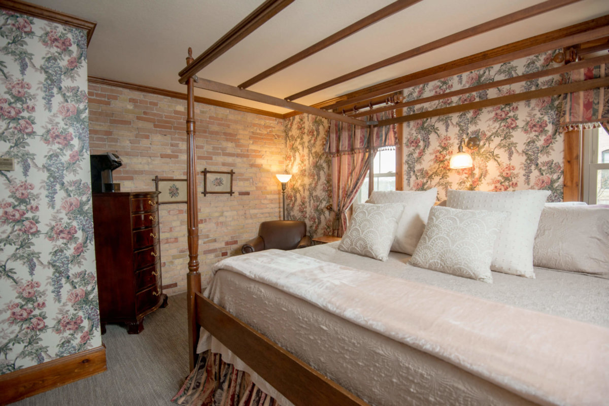 A king size hand-carved mahogany canopy bed is the centerpiece of this impressive luxury suite with exposed brick. Relax before bed next to the gas fireplace.